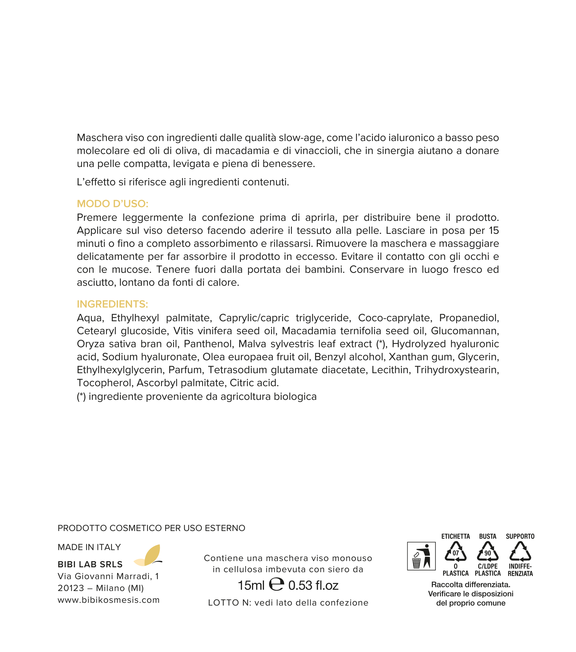 La Maschera Bellezza senza tempo - Slow Age di BiBi Kosmesis è un cosmetico naturale, vegano dermatologicamente testato.